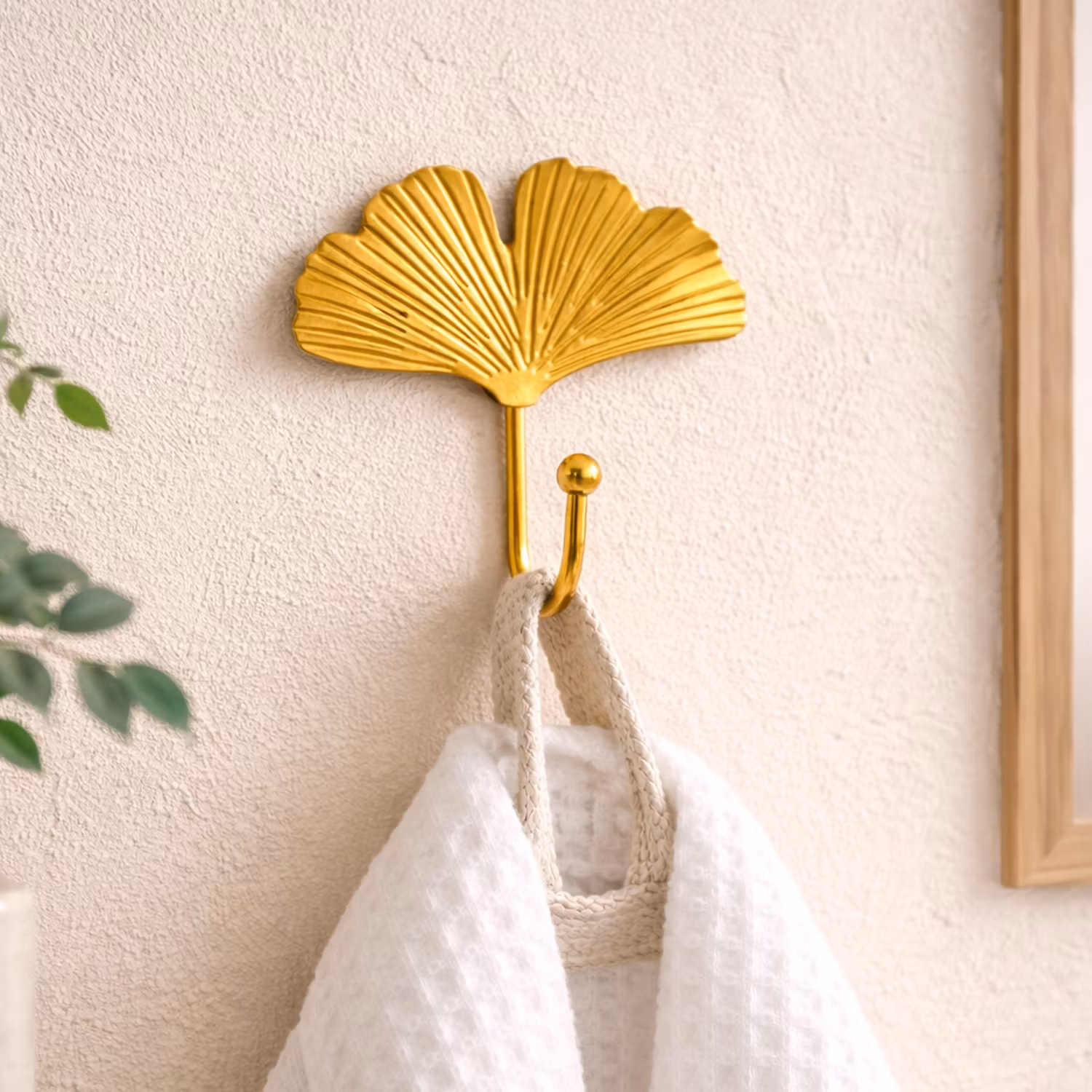 En dekorativ väggkrok i form av ett gyllene blad som passar fint som både praktisk krok och snygg detalj i hemmet. Den stilrena designen gör att den fungerar bra i hallen, badrummet eller sovrummet för att hänga upp exempelvis handdukar, smycken, nycklar eller lättare plagg.