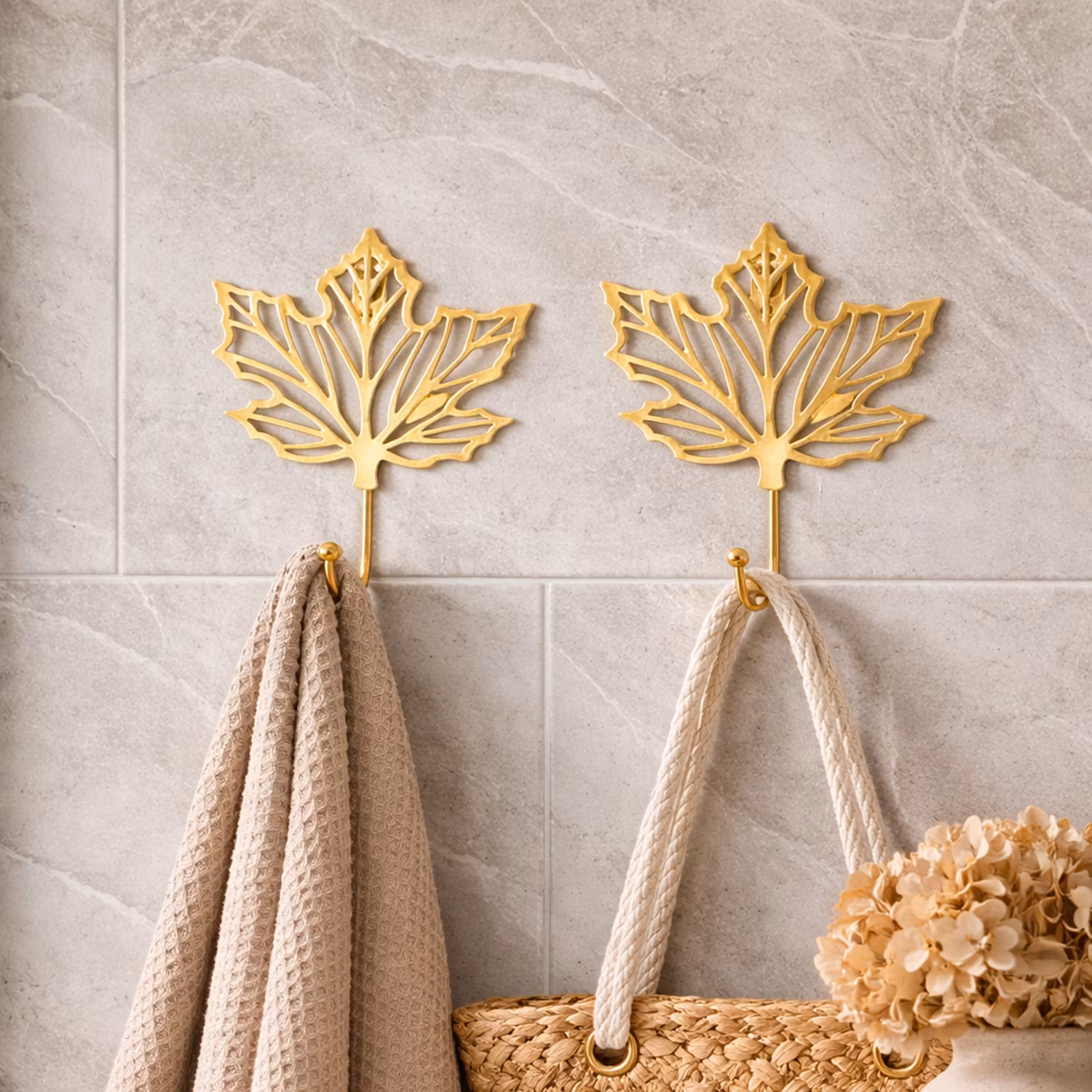 Dekorativa väggkrokar i form av gyllene blad som passar fint i hallen, sovrummet eller badrummet. Den stilrena bladdesignen ger ett elegant intryck samtidigt som krokarna är praktiska för att hänga upp exempelvis nycklar, smycken, handdukar eller lättare plagg.